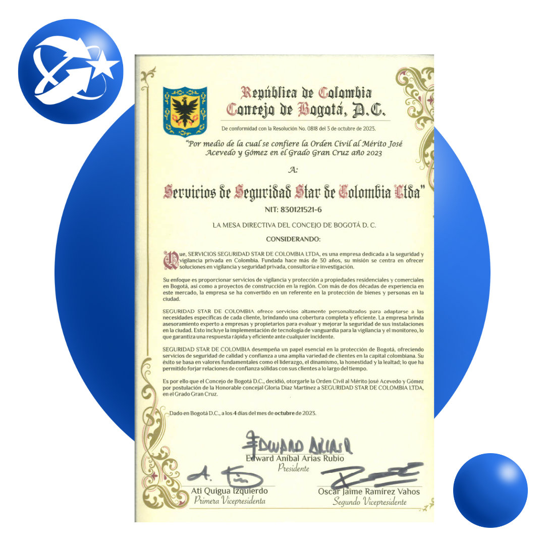 En Seguridad Star de Colombia, ofrecemos soluciones integrales en vigilancia, seguridad privada, consultoría e investigación con un equipo competente y tecnología avanzada para prevenir riesgos, generar confianza y asegurar el bienestar de todos.
